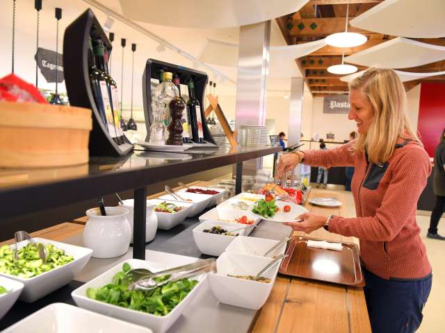 Das moderne Selbstbedienungsrestaurant Ämpächli mit Kaffeebar und grosser Sonnenterrasse ist der zentrale Treffpunkt für Gross und Klein.